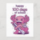 Een echt ontwerp met een axolotl in een rugzak en een grote pen met de uitspraak "Happy 100 dagen school". Fijne 100e dag van de school of de kleuterschool.