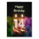 Un gâteau d'anniversaire avec des bougies. Les bougies sont composées du numéro 14, pour un 14ème anniversaire. Une carte d'anniversaire adaptée à tous.