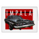 Digitaal verbeterd afbeelding van het achterste 3/4 uitzicht van een zwarte Chevrolet Impala van 1961 op een rode rechthoekige achtergrond met het woord IMPALA erboven.
