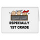 Drie stokfiguren kinder met grote glimlach hebben een schrijfbord waarop staat: "School is Cool!" en in de zwarte tekst staat "Speciaal 1ste graad" op de School van de eerste klas: Cool T-shirts, mokken, knoppen, magneten, stickers, kaarten en andere artikelen die perfect zijn voor kinderen in de eerste klas en leraren in de eerste klas!