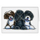 Tekening van drie kleuren Portugese waterhonden: zwart, zwart wit en bruin wit. Kunst door Andie.