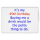 "Het is mijn 45e verjaardag, een drink kopen zou het beleefde ding zijn om te doen." Het humoristische ontwerp voor die 45-jarige die graag mensen aan het lachen wil maken en als er een vrije drink uit de deal komt, dan is het dat ook.
