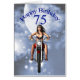 Een mooi meisje fietst door de sterren aan de hemel. Een heel andere verjaardagskaart voor het man dat van een motor houdt!