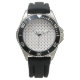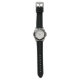 A wristwatch displayed in two views: front with a patterned dial and black bezel, and back showing a metal clasp on a black rubber strap.