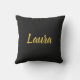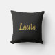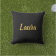 De gouden tekst van Faux kan op deze zwarte worp kussen worden gepersonaliseerd.