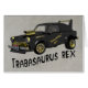 Een computergegenereerd, zwart en goud, afbeelding van een op maat gesneden Oost-Duitse Trabant-auto. De bijnaam van de aangepaste auto, Trabasaurus rex, in een passend lettertype, staat zowel op de deur van het voertuig als onder het afbeelding. Het voertuig beer een Idaho-bord met de tekst "TRABI REX", zoals het werd aangepast door mythical Warschau Pact Wonder Wheels (Classic Commie Cars) in Sandpoint. De Trabant was de personenauto van Oost-Duitsland "Trabant" betekent reisgezelschap en werd geïnspireerd door het Russische woord "sputnik" met dezelfde betekenis. In de loop van 30 jaar werden meer dan 3 miljoen Trabants geproduceerd. De Trabant's motor was onderaangedreven, inefficiënt en veroorzaakte veel vervuiling. De veel misleide Trabant, of Trabi zoals het algemeen bekend was, is al lang het kont van grappen, maar is de afgelopen jaren trendy geworden. Sommige zijn ingevoerd in de Verenigde Staten. Het dak, het kofferdeksel, de motorkap, de omhulsels en de deuren zijn gemaakt met Duroplast, een harde plastic zoals Bakelite, gemaakt van gerecycleerde materialen: katoenafval uit de Sovjet-Unie en fenolharsen uit de Oost-Duitse kleurstofindustrie. Dit maakte van de Trabant de eerste auto met een lichaam van gerecycleerd materiaal en was deels verantwoordelijk voor het misverstand dat het gemaakt was van karton. Diverse crashtestresultaten lieten zien dat het beter presteerde dan vergelijkbare hedendaagse Westerne hatchbacks.