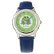 Gespecialiseerde, schattige groene kikker kinder horloge ontworpen met een schattige groene kikker in het midden met groen rond de buitenrand en de getallen in wit. Jouw naam dat je jezelf personaliseert, wordt in groen onder de kikker gedrukt. Het is perfect voor iedereen die van schattige glimlachende kikkers houdt en de kleur groen. Kies uw kleur van de horlogeband!