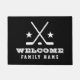 Aangepaste klepmat met kruiste ijshockeysticks en puck. Zwart-wit tapijt met persoonlijke familienaam of persoonlijke tekst. Athletische typografie met sportief logo. Verkrijgbaar in kleine en grote afmetingen. kleuren.