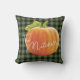 Fun en schattig kussen in de buitenlucht gooien met felle, oranje en kalkgroene, in het najaar gekleurde pompoen van het seizoen van de Thanksgiving op een klassiek zwart-groen gevriesdroogd vlechtpatroon. Met ruimte om aan te passen of met familie of (beperkte) tekst van uw keus te personaliseren. Stijlvol rustig, uniek decor-accent buitenshuis voor het versieren van de voorste veranda of tuin van uw landhuis, blokhut, bergkam, viskamp, meer- of riviervakantiehuis.