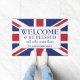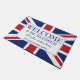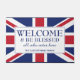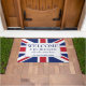 Aangepersonaliseerde UNIE JACK Welkom Doormat. Stijlvol, patriottisch WELCOME metaal-teken met de formulering WELCOME & BE BLESSED ALL DIE HIER INGEVOEGD plus placeholder name. De achtergrond is de JACK-vlag van het VERENIGD KONINKRIJK. Alle tekst is , zodat u de formulering kunt aanpassen aan uw behoeften.