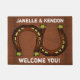 Twee hoefijzers op een bruine achtergrond maken een dandy western met de naam 'welkome mat'.