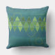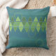 Een zeer kunstzinnig werpkussen met een blauw waterverf-achtige achtergrond met rijen driehoeken in tinten van groene en abstracte cirkels. Rustig en aangenaam voor de zintuigen! Verkrijgbaar in verschillende maten en vulkeuzes!