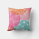Dit waterverf abstract patroonkussen met spatten van roze, blauw en sinaasappel vlekken en driehoeken, maakt een mooie toevoeging aan de kinder kamer.