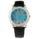 Dit mannen horloge heeft een geometrisch ontwerp van een grote blauwgroen rechthoek in de linkerbovenhoek, donkerdere blauwgroen strepen in de rechterbovenhoek, een lichtere kleinere blauwgroen rechthoek onder de strepen en zwarte lijnen aan de onderkant. Als je van het ontwerp houdt, maar de voorkeur geeft aan verschillende kleuren, stuur me een bericht.