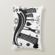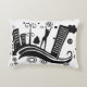 Een stijlvol rechthoekig kussen met een gedurfd zwart-wit stedenbouwkundig ontwerp met wolkenkrabbers, bomen, abstracte vormen en een silhouet van een persoon die feest viert. Een modern en artistiek accentstuk voor een eigentijdse inrichting van het huis.
