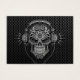 Un design élaboré de crâne à sucre DJ décoré de tourbillons complexes et de motifs à points. Les écouteurs sont assis sur le dessus du crâne avec deux fils suspendus en dessous. Les lignes et les cercles complexes sont en noir massif tandis que l'intérieur du crâne est fini avec des textures en acier inoxydable et des couleurs argentées. Le crâne est posé sur un arrière - plan en maille d'acier qui complète ce motif industriel. Cette image agressive de Day of the Dead est une représentation colorée de la culture DJ.