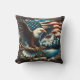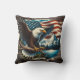 Een krachtige adelaar ligt op een tak met een Amerikaanse vlag achtergrond, omringd door bergen en bomen onder een heldere hemel.