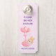 Un affichette de porte qui dit : Ne pas déranger (le texte peut être changé / personnalisé) avec une adorable illustration. Un petit lapin portant une petite couronne dorée. Porté par des ballons dans une couverture de coeur rose.