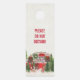 Porte-suspendre avec un thème de Noël mignon et fantaisiste. Une remorque cosy décorée pour Noël, installée parmi quelques pins.