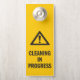 Nettoyage en cours de mise en garde porte bouton cintre en noir sur la prudence jaune avec un symbole d'alerte de prudence. Un service de nettoyage peut être accroché à la porte de la salle de bain ou à d'autres usages professionnels pour les personnes usées la chambre est fermée pour le nettoyage. Même conception de part et d'autre.