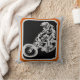 Een afdaling mountainbike en ruiter. De fiets is in het grijs getekend, met behulp van "witte ruimte" techniek op een zwarte achtergrond. De rijder gaat heuvelafwaarts en krijgt perspectief door het voorwiel van de fiets groter (dichterbij) te zien dan de achterkant.