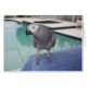 Congo-Afrikaanse grijze papegaai die op haar blauwe handdoekje staat en geniet van de zon! grijze veren met scalloped tegen een achtergrond van aqua groen en blauw. Ideaal voor de vogelliefhebber in jou!