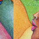 Gestileerde Afrikaanse vrouw portret, dragen en omgeven door heldere kleuren van de traditionele wax stof ontwerp. Originele handtekening Copyright BluedarkArt.