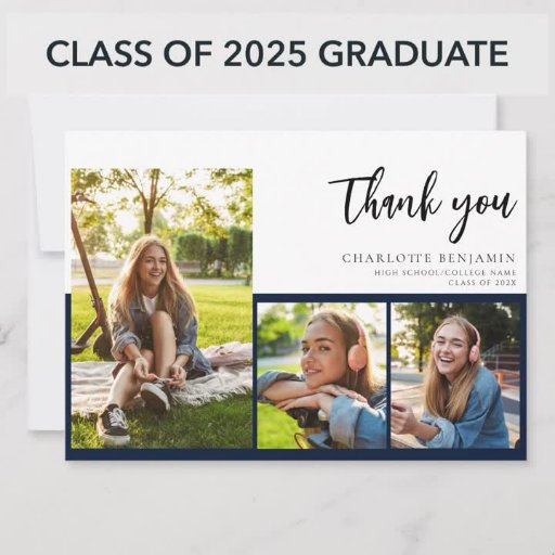 Afstuderen 4 Fotocollage Script Navy Blue Script Aankondigingskaart. Pas dit eenvoudig aan door de tekst te wijzigen en de foto's te vervangen door die van jou. Een moderne en trendere manier om dit jaar je afstuderen aan te kondigen!