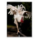 Coq blanc battant ses ailes en équilibre sur une clôture. Photographie.