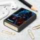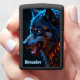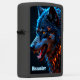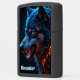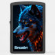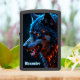 This personalized pocket lighter features a vibrant digital illustration of a wolf head glowing with elemental power. The fur is rendered in brilliant shades of electric blue and deep teal, sharply contrasted by fiery orange and gold highlights that trace the mane and the wolf's intense eyes. At the bottom, the embossed text Alexander is prominently displayed in a light blue gothic-style font. The matte black metal case provides a sleek decorative border that emphasizes the high-contrast colors of the central artwork. As this is a functional personal accessory, the design focuses on the predator imagery and does not include a clock face border.