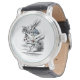 Dit leuke horloge voor fans van het boek Alice's Adventures in Wonderland van Lewis Carroll uit 1865 toont een illustratie van het witte konijn dat een herald is aan het hof van de Koningin van Harten. Het konijn draagt een tabard versierd met harten terwijl hij op zijn kleine trompet blaast om een zeer belangrijke aankondiging te doen. De originele zwart-wit tekening is van John Tenniel. Ik heb selectieve kleuren toegevoegd aan de boog van het witte konijn en de hartvormen op zijn kostuum.