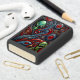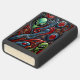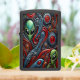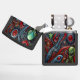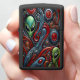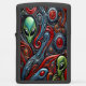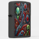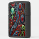 Twee groene aliens kijken nieuwsgierig vanuit een caleidoscoop van wervelende kleuren en ingewikkelde patronen.