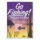Allez pêcher ! Affiche de voyage amusante, de style vintage ou rétro, d'un pêcheur sur un lac au coucher du soleil du soir.