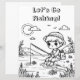 Allons pêcher ! Jolie page de coloriage avec un thème de camping. Un petit garçon pêchant dans un lac entouré de montagnes et d'eau. Idéal pour une école, une maternelle ou une fête d'anniversaire.