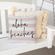 Blush roze gestreepte kussen in de buitenlucht zijn bijna een zomer met "aloha stranden" die zijn bedekt met een zwart handschrift. Een perfecte aanvulling op je poolgebied, achtertuin of strandhuis.