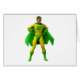 Illustratie van een geweldige superheld in een geel en groen kostuum met een cape die met handen op een heup staat