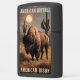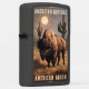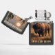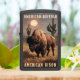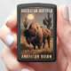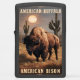 Een eenzame Amerikaanse bizon staat in een woestijnlandschap onder een ondergaande zon, omringd door cactussen.