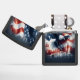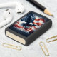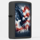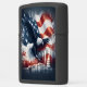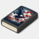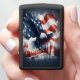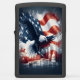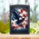 Een arend die over een skyline van de stad vliegt met op de achtergrond de Amerikaanse vlag.