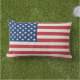 Patriottisch home accent lumbar pillow heeft een Amerikaanse vlag met sterren en strepen in blauw, rood en zachte witte kleuren.