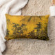 Deze mooie kunstkussens geeft een indruk van een eeuwenoud Chinees oosterse landschap. Twee kleine figuren lopen door bomen naar een pagode op de voorgrond. De bergen liggen op afstand. De herfstkleuren zijn goud, geel, oranje, groen, bruin en zwart.