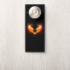 Engel vuurhart met vlammende vleugels op zwarte achtergrond.
