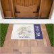 Een gepersonaliseerde welkomstdeurmat ontworpen met een serene engel met gele vleugels die een herdersboef vasthoudt. Zittend naast 2 witte pluizige lammeren.