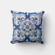 Antiek Azulejo Tegel Floral Pattern in blauw en wit, vervoerd naar het oppervlak van een kussen, met behoud van de geschiedenis en traditie. Azulejo is een vorm van Portugees of Spaans geschilderd, met tinten geglazuurd, keramisch tegelwerk. Het is een typisch aspect van de Portugese cultuur geworden. Portugal importeerde azulejo-tegels uit Spanje en het gebruik ervan was wijdverbreid in de religieuze en particuliere architectuur, met name in gevels.