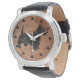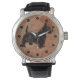 Leuk horloge gedaan in een antiek ogend bruin verdrietig leer, met in het midden een zwarte afbeelding van een Schotse terriër. Leuke zwarte pootafdrukken vertegenwoordigen de uren. Aanpassen om tekst toe te voegen die u wilt.