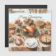 Aquarelillustratie van een prachtig gearrangeerde Thanksgiving-maaltijd op een houten eettafel. Het middelpunt is een geroosterde kalkoen omringd door een reeks kleurrijke schotels. Kleine decoratieve pompoenen accentueren de tafel en er zijn kaarsen die een warme gloed geven. De tafelopstelling omvat borden, bestek en glazen, waardoor een sfeervolle, feestelijke sfeer ontstaat. Ontworpen door kunstenaar Danguole Serstinskaja