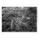 Une carte avec une photo en noir et blanc d'un arbre coupé disposé en tas dans le sous-bois. .
