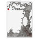 Image dessinée à la main en noir et blanc avec pomme rouge pendant d'une branche rongée.