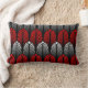 Lumbaal kussen in een Art Deco behangpatroon gebaseerd op een gestileerde veer - tinten zilvergrijs / grijs en diep Chinees rood op een zwarte achtergrond