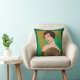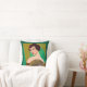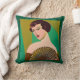 Kussen in een modern, semi-abstract, Art Deco geïnspireerd portret van een demure dame, met een ventilator, tegen een jade groen en goudkleurige achtergrond