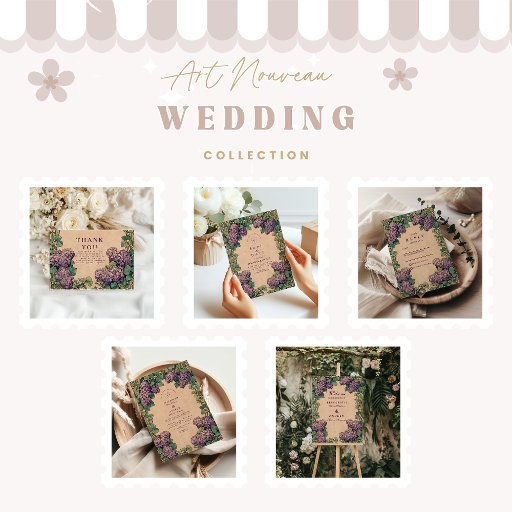 Romantisch en tijdloos, dit Art Nouveau bruiloftsontwerp heeft weelderige lila bloesems in zacht paarse tinten, omlijst met elegant groen gebladerte op een achtergrond. De botanische stijl combineert klassieke kunst met natuurschoon, waardoor het ideaal is voor lentebruiloften, tuinceremonies of koppels die van bloemige elegantie houden met een vleugje nostalgie. Volledig aanpasbaar met uw persoonlijke gegevens.